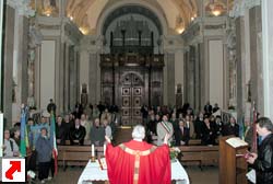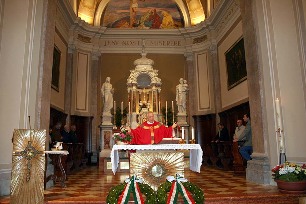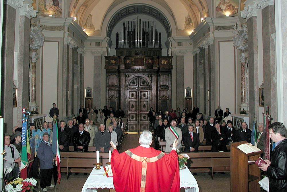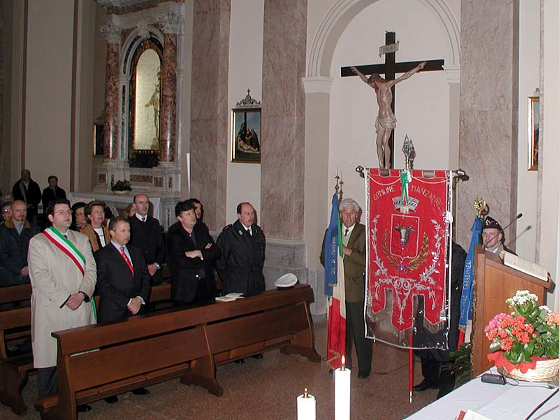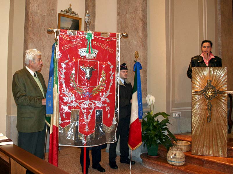 Manzano, 25 Aprile 2005 Santa Messa in occasione del 60° anniversario della Liberazione Manzinello - Oleis - Rosazzo - San Lorenzo - San Nicolò - Soleschiano Informazioni turistiche: Pro Loco Manzano Biblioteche: Biblioteca Comunale C. Percolo, p.zza della Repubblica (apre i pomeriggi e sa. mattina) Escursioni: Fiume Natisone - Sentiero naturalistico «dal bosco della Sdricca ai colli della Manzanizza» - Colline di Manzano - Rosazzo - Case - Poggiobello - Abbazia di Rosazzo - Palazzo Ottelio - Palazzo Martinengo - Casa natale di Caterina Percolo - Castelliere della Sdricca - Ruderi del Castello di Manzano La Chiesa parrocchiale di Manzano, dedicata a S. Maria Assunta, ottocentesca, conserva un altar maggiore in marmo costruito nel 1897 dai fratelli Paron di Ontagnano ad imitazione di quello di Latisana, con statuette del Redentore e dei due angeli nel ciborio scolpite da Temistocle Sarti di Pietrasanta in Toscana; le statue laterali dei Ss. Giuseppe e Giovanni Evangelista sono della ditta Busnelli di Seravezza in Toscana. Di maggior pregio gli altari laterali, settecenteschi, in marmi pregiati, provenienti dalla chiesa dei Barnabiti di Udine. Gli affreschi del soffitto del presbiterio e dei due altari laterali sono opera di Giuseppe Barazzutti di Gemona (1921); la Crocifissione nella lunetta è di Giovanni Pittini di Tarcento (1959). In sagrestia, un bel mobile intagliato da Matteo Deganutti cividalese (1790). A Manzinello, la Chiesa di S. Margherita ha un affresco nella lunetta raffigurante la Crocifissione (probabilmente di Giovanni Fantoni, ca. 1920); nella parete destra è appeso un affresco, staccato e montato su pannello, con i Ss. Antonio Abate con il maialino, Elisahetta e Giacomo, opera di modesto pittore friulano della fine del secolo XV. Nella Chiesa di S. Lorenzo, del 1890, altare marmoreo della fine del XVIII secolo dovuto ad Adeodato Pariotti scultore udinese; le statue raffigurano i Ss. Lorenzo e Giovanni Battista. Ad Oleis, Chiesa parrocchiale costruita su progetto di don Leonardo Piva con strana facciata gotica (1888-1890); nella Chiesa di S. Tommaso a Case, bell'altare settecentesco con statue di S. Eurosia e S. Tommaso Apostolo e gradevole dipinto con la Madonna con Bambino nell'ovale. Il monumento storico più conosciuto del Comune è la celebre Abbazia di Rosazzo che domina, dall'alto del colle su cui è costruita, su largo tratto del Friuli orientale. Vi si giunge attraverso una amena strada che si insinua tra estesi vigneti, che danno vini prelibati, tra i quali il nobile Picolit, e prati soleggiati, ricchi in primavera e in estate di profumati fiori (Rosazzo prende il nome dalle rose selvatiche qui abbondanti, tanto che nel 1161 venne chiamato «Monasterium Rosarum»). Il complesso degli edifici, una sorta di borgo fortificato, si incentra attorno alla Chiesa di S. Pietro, riattata nel XVI secolo; e conserva ancora un suggestivo sapore medioevale che fa pensare a tempi lontani, quando qui esisteva un oratorio del IX secolo; e quando nell'XI secolo gli Eppenstein munirono il sito, che fu dunque rocca militare prima di essere assegnato agli agostiniani e, successivamente, ai monaci benedettini. Secoli di storia sono passati attraverso l'Abbazia di Rosazzo, che visse l'ora più tragica quando il duca di Brunswich, nel 1509, prese d'assalto il castello e, massacrati gli abitanti, ne ordinò la distruzione. Dell'antico complesso originario ben poco rimane: un edificio rustico adiacente all'ingresso attuale, il possente torrione ad ovest alto sei piani e parte del tracciato della cinta abbassata e distrutta nell'Ottocento, quando il complesso fu trasformato in residenza arcivescovile estiva. La Chiesa ed il chiostro furono restaurati nel 1533 per volere del commendatario e vescovo di Verona, Giovanni Matteo Giberti. In tale occasione venne affidato al pittore Francesco Torbido, un veronese seguace del Giorgione, il compito di affrescare il coro della chiesa. Fu quanto il Torbido fece, nel 1535, dipingendo i simboli degli Evangelisti nelle vele, la Trasfigurazione, la Vocazione di S. Pietro e la Pesca miracolosa nella pareti. Madonna con Bambino e Santi nell'arco trionfale. Affreschi tutti, nei quali la narrazione pacata, lo spazio dilatato, i colori tenui, mostrano il pittore non insensibile alla poetica del Lotto. Nell'ex refettorio, una Crocifissione a fresco recentemente restaurata viene attribuita al veronese Battista dell'Angelo detto il Moro, cognato del Torbido (1535). L'altare maggiore è degli scultori udinesi Mattiussi e risale al 1756. Tra le ville, la più spettacolare è Villa Brazzà Martinengo a Soleschiano, settecentesca, con imponente parte centrale; hanno qualche motivo architettonico di rispetto Palazzo Ottelio (XVII secolo, con bella inferriata sulla vera da pozzo), Palazzo di Trento, Palazzo Deciani, Palazzo Morelli de Rossi. Esempio di architettura eclettica di periferia è Palazzo Braida ad Oleis (fine secolo XIX).