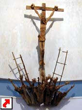 All'interno si può ammirare il gruppo della Crocifissione, pregevole opera in legno di noce dello scultore friulano Franco