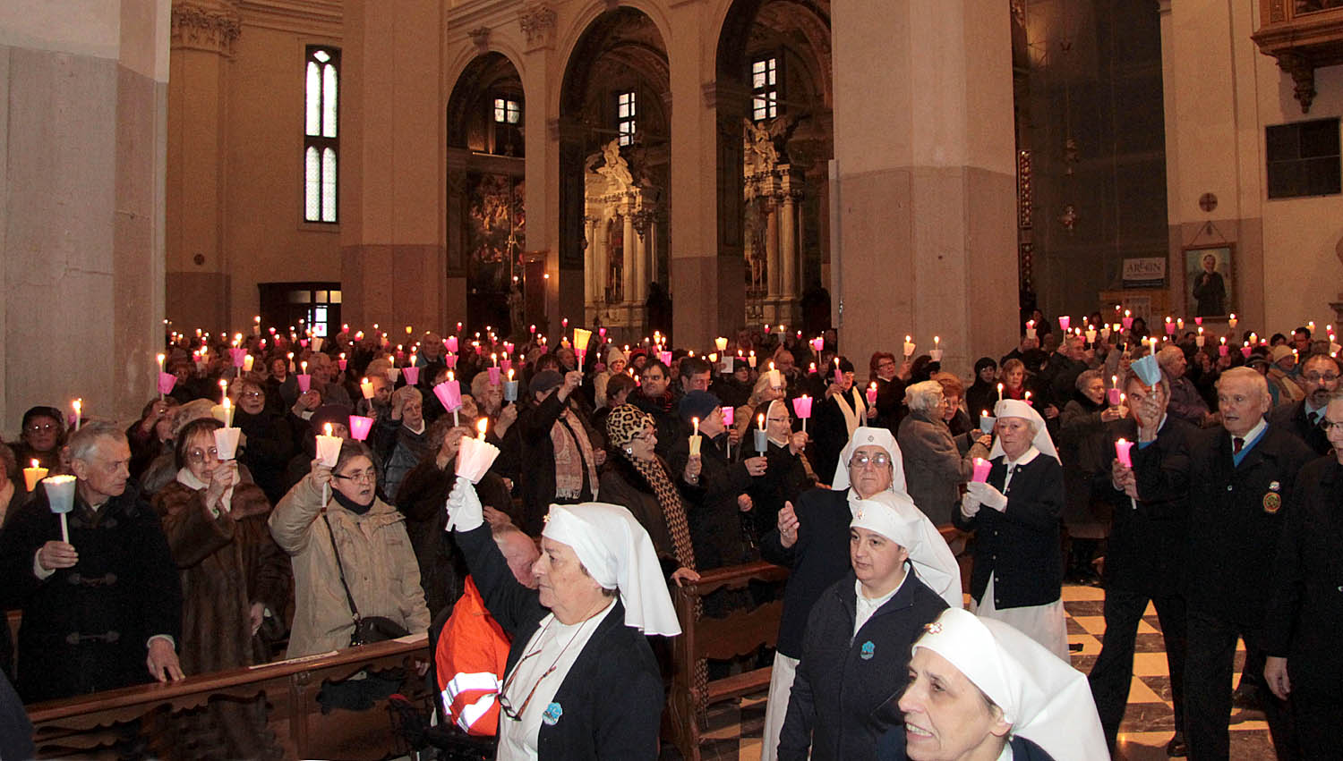 la navata per dare inizio alla Messa accompagnata dal coro dell'Unitalsi