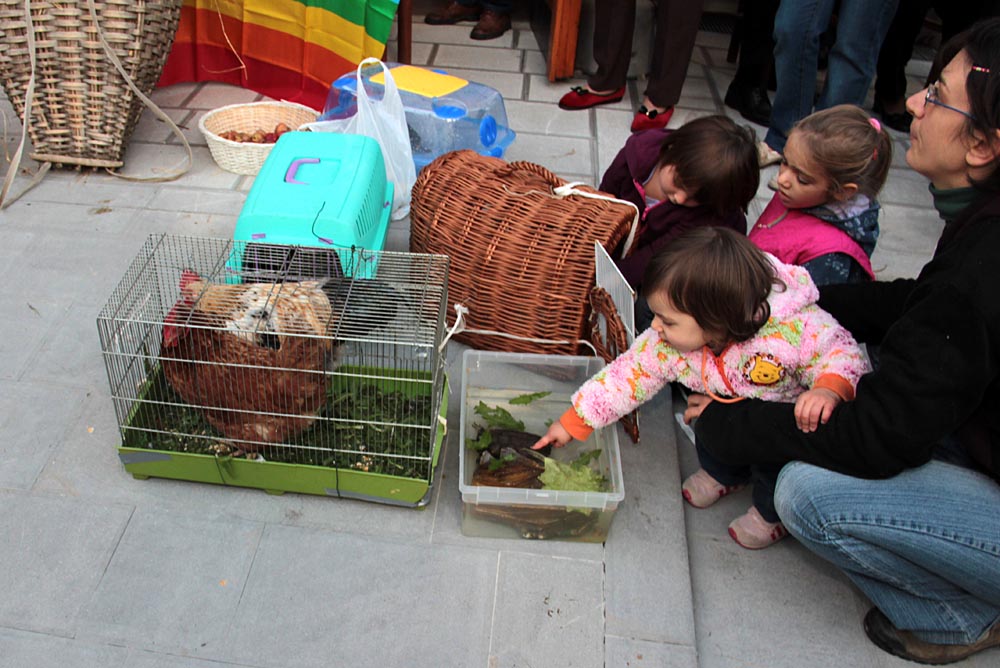 accanto a galline e conigli, si radunanoi bambini, tra cestini