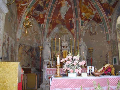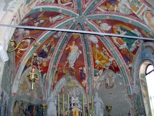 Gli affreschi del "Pordenone"Finalmente, ho potuto chiedere informazione sull'orario della Messa ad una signora, che stava controllando se spuntava qualche cosa in un... strop di lidric. Avute le informazioni che cercavo, mi sono recato di nuovo nello spiazzo davanti alla chiesa di San Lorenzo, in attesa del suono delle campane. Anche mezz'ora prima ero stato sotto il campanile per la registrazione delle campane, ma in quell'occasione ho potuto ricevere solo il "gong" delle 09:30. Questa volta, dopo i dieci rintocchi, le campane si sono sciolte in un festoso... interminabile concerto...! Cessato l'ultimo riverbero, ho raccolto le attrezzature necessarie e sono entrato nel Tempio. All'interno di quella chiesa del XVI ho potuto ammirare gli affreschi del "Pordenone", e mi sono dato subito da fare per "catturare" quelle meravigliose immagini. Non solo per quei famosi affreschi, ma tutto l'interno di quella piccola chiesetta era come uno scrigno pieno di meraviglie ordinate e pulite.