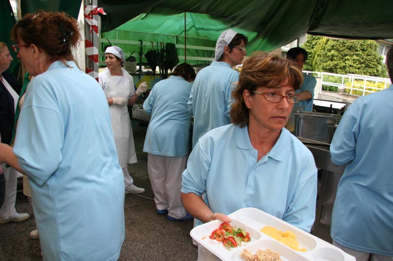 ha iniziato la distribuzione del cibo ancora fumante nella varie tavolate, che