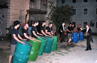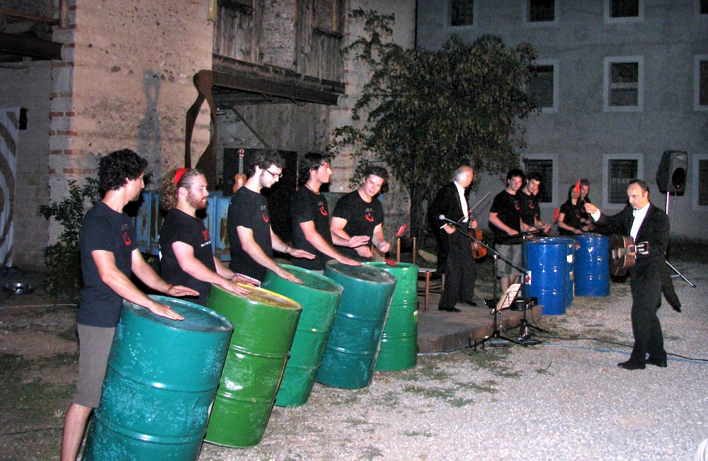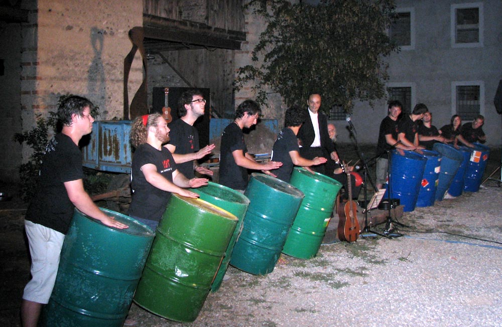 ritmicamente battuto su dei grandi e colorati bidoni di gasolio da 200