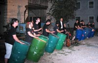 ragazzotti spavaldi, scatenati nel percuotere dei bidoni industriali