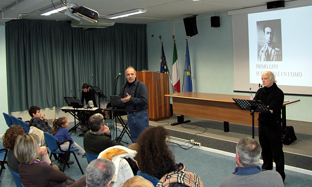 Due attori al leggio, supportati dalle musiche dal vivo e da video