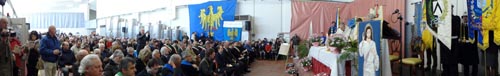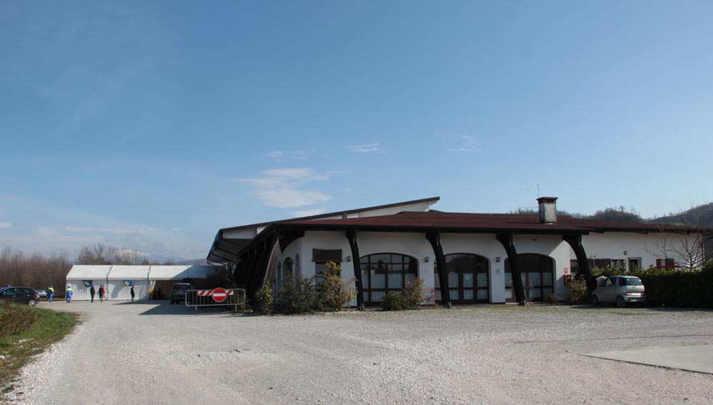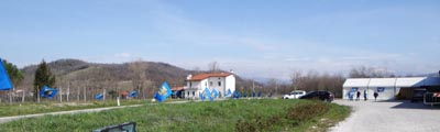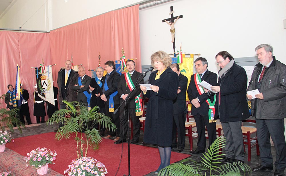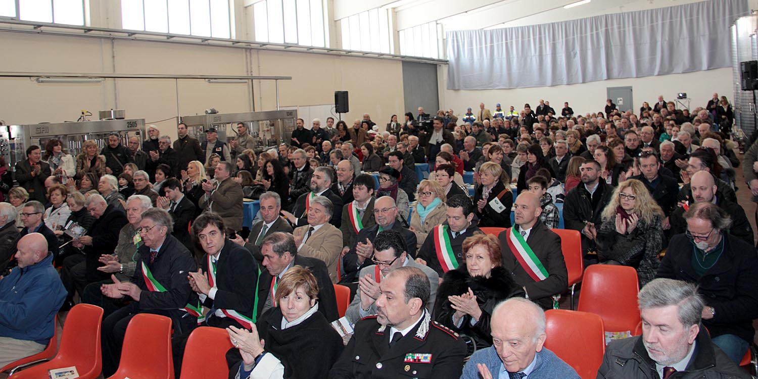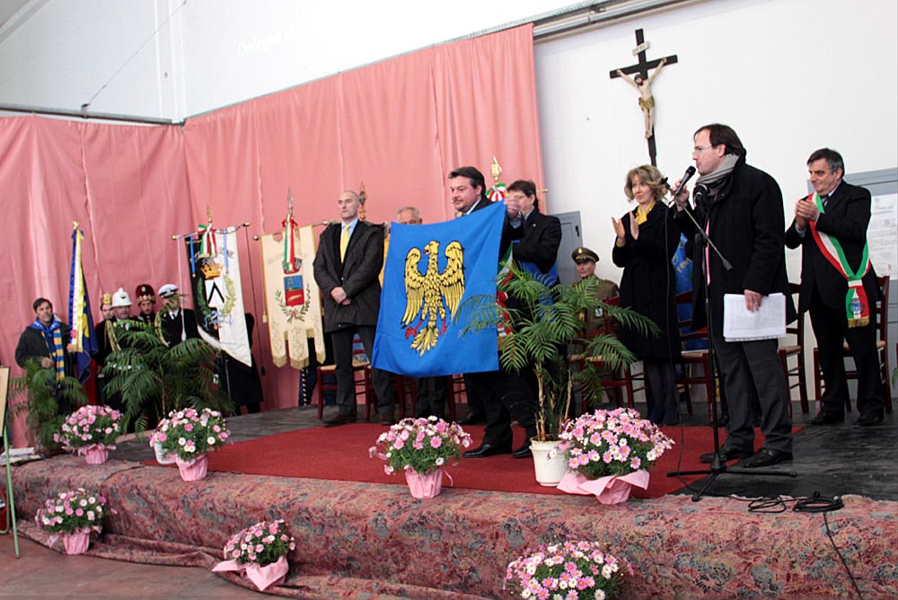 capannone della cooperativa, si stagliava i gonfaloni delle tre