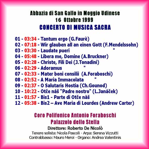 Il programma del concerto a Moggio Udinese era lo stesso eseguito dal Coro di Palazzolo ad Abbazia di Rosazzo il 10 Ottobre scorso, ed in altre locatità del Friuli. L'Abbazia di San Gallo aveva però un'ospite d'eccezione, la Madonna Missionaria di Tricesimo. E' per questo che alla fine del concerto il Coro A. Foraboschi ha cantato un'Ave Maria.
