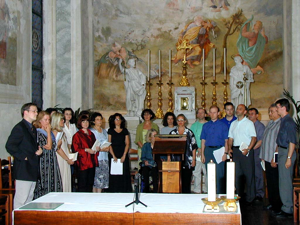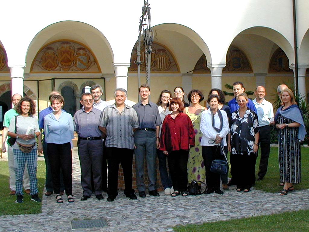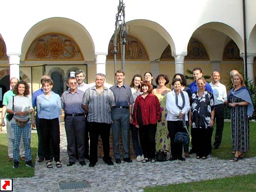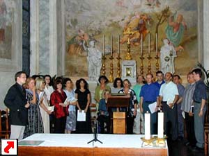 La foto-ricordo nel chiostro dell'Abbazia, prima del saggio.L’USCI (Unione Società Corali del Friuli-Venezia Giulia) ha organizzato l’annuale Seminario Internazionale di Canto Gregoriano, giunto alla settima edizione, per direttori di coro e coristi, che si è svolto durante la settimana da Lunedì 16 a sabato 21 luglio 2001.