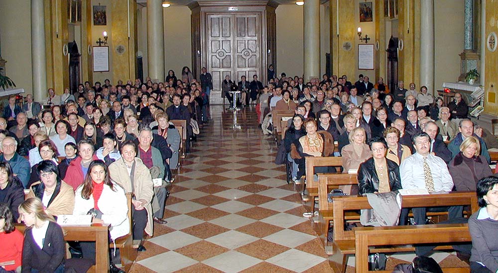 orchestra. A destra, il pubblico all'interno della parrocchiale