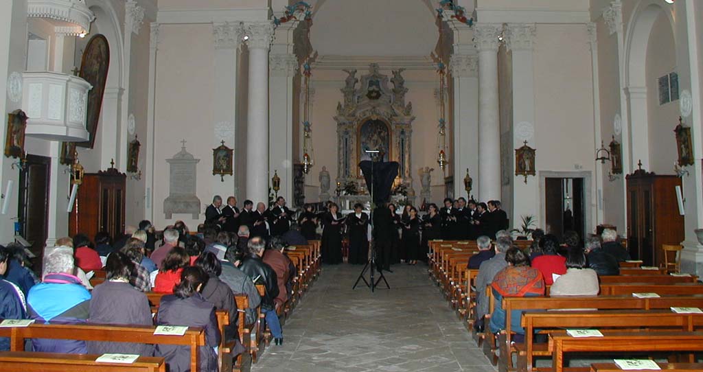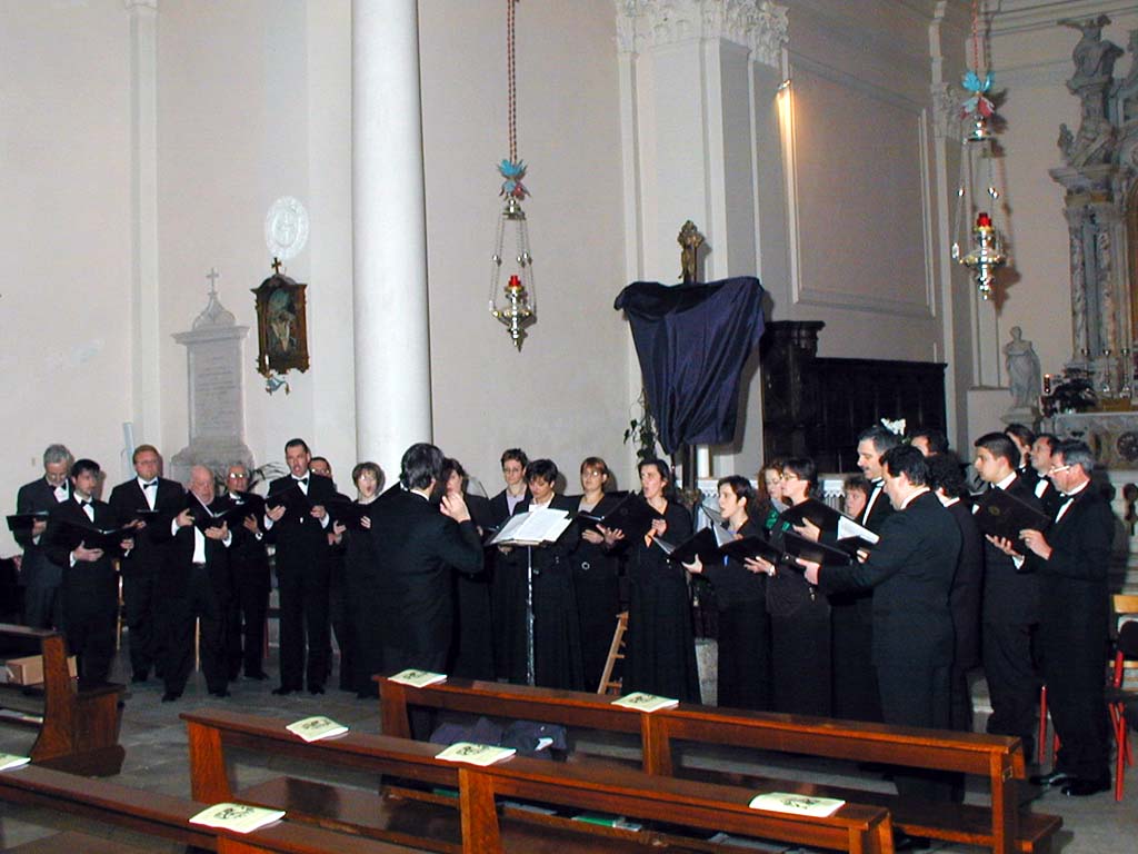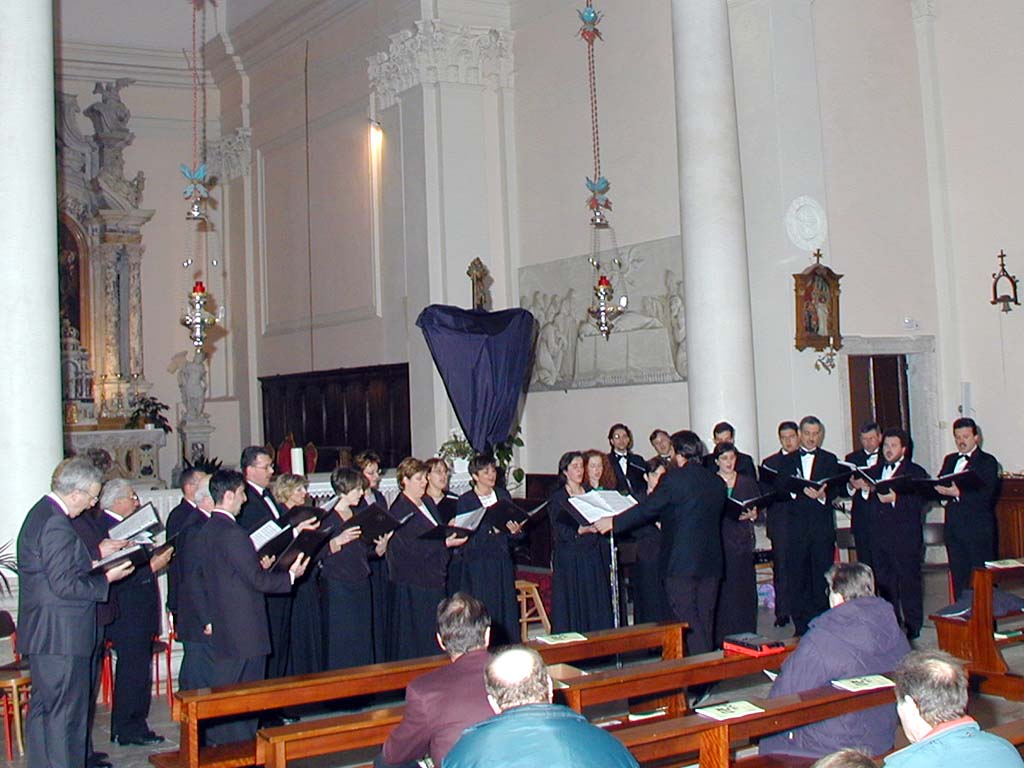 LA POLIFONICA FRIULANA JACOPO TOMADINI La "Polifonica Friulana Jacopo Tomadini" è stata fondata nel 1968 ad opera di padre Vittoriano Maritan (O.F.M.), quale sostegno musicale alla liturgia presso il Santuario di "Madonna di Rosa" a San Vito al ragliamento (PN) e come associazione culturale volta alla divulgazione del patrimonio corale polifonico. Attualmente composta mediamente da 35 elementi, svolge un intenso lavoro di studio tecnico, e stilistico delle partiture, con una particolare attenzione rivolta all'affinamento della tecnica vocale personale. Promuove, inoltre, manifestazioni musicali (sia vocali che strumentali), seminari sulla vocalità e corsi di educazione musicale nel sanvitese nonché scambi culturali fra realtà corali italiane ed estere di diversa origine. La Polifonica si è esibita in tutta Italia, in tutta Europa, in Canada e alle Isole Canarie, ha preso parte a numerosi concorsi e rassegne nazionali ed internazionali: I° premio a San Daniele del Friuli, II° premio a 'Vittorio Veneto e Ravenna, III° premio a Guastalla e Vallecorsa, oltre a buone affermazioni ad Arezzo, Liangollen (Gran Bretagna), Gantonigros (Spagna) ed Alghero. Già diretta da padre Vittoriano Maritan, Gioacchino Perisan, Piergiorgio Righete e Maurizio Lo Finto, dal luglio 1997 la direzione musicale, artistica e tecnica, dell'Associazione è stata assunta da Sandro Bergamo. Per le proprie esigenze di accompagnamento all'organo, e per le ricerche musicologiche si avvale della costante collaborazione di Marco Rossi. L'associazione, inoltre, è iscritta al nr.583 del Registro Generale delle Associazioni di Volontariato al settore Cultura con Decreto del Presidente della Giunta Regionale nr. 108/vol/p. Dopo il superamento della soglia dei 30 anni dalla sua fondazione, prosegue incessantemente nel lavoro di divulgazione del patrimonio corale, con particolare attenzione ai repertori inediti, oltre che di raro ascolto ed esecuzione. In questa ottica si collocano alcuni programmi proposti nel corso di questi ultimi tre anni. E' il caso del progetto "Ad Matutinum Patris Seraphici Francisci", sorta di ricostruzione liturgica con composizioni gregoriano, organistiche e polifoniche comprese tra il XVI ed il XVII secolo, già vincitore del "Premio Speciale Corovivo" (Confronti itineranti Corali, USCI Friuli Venezia Giulia 1999) ed in seguito in numerosi concerti, dal 1998, in Germania (Berlino, Stadtiohn, Zwilibrock), in Piemonte (Pinerolo) e in diverse località del Veneto (Padova, Marghera, Chiampo) e del Friuli Venezia Giulia (Trieste, San Vito al Tagliamento, Povoletto, Nimis, Cordovado) fino al recentissimo appuntamento all'Abbazia di Rosazzo, nell'ambito dei concerti "Musica e Rito" organizzati in occasione del Giubileo 2000. Oltre a repertori prettamente corali a cappella, ovvero senza accompagnamento di strumenti, nel 2000 la Polifonica Friulana Jacopo Tomadini, ha affrontato un nuovo affascinante percorso musicale per coronare degnamente la conclusione dell'anno giubilare festeggiando inoltre l'avvento del tanto atteso XXI secolo. Si è trattato della proposta Te Deum, ovvero di un programma che comprendesse diverse letture di quest'opera sacra. La particolarità della scelta era in riferimento alla diversità delle proposte, a partire infatti dal brano composto da Tomas Luis de Victoria in epoca rinascimentale per coro misto a quattro voci a cappella (alternato a sezioni gregoriane) per passare ad un Te Deum settecentesco, W. A. Mozart, per voci e strumenti fino a chiudere con la più recente composizione del musicista estone Arvo Part, che vede impegnato il coro con una variegata proposta di timbri orchestrali. La scelta di avvicinare il coro ad un complesso strumentale orchestrale ha voluto essere il ritorno di una proposta che nel passato aveva già impegnato la Polifonica Friulana Jacopo Tomadini in tappe di particolare interesse artistico della sua vita musicale. A tal proposito si ricordano le storiche esecuzioni della "Missa Ducalis" di J. Tomadini (coro virile, organo ed orchestra) eseguita in collaborazione con l'Orchestra da Camera di Sacile (1983), dei brani corali tratti dall'oratorio "II Messiah" di G. F. Haendel (coro misto ed orchestra) per finire nel 1988 con l'esecuzione della "Kronungsmesse" (in collaborazione con il coro di Stadtiohn e l'orchestra barocca di Groningen) In tutte le occasioni il richiamo di pubblico ed il particolare repertorio proposto .hanno confermato la validità anche esecutiva delle iniziative, validità che la Polifonica Friulana Jacopo Tomadini ritiene di perseguire con la massima serietà ed impegno dei suoi cantori, del suo Direttore e collaboratori.
