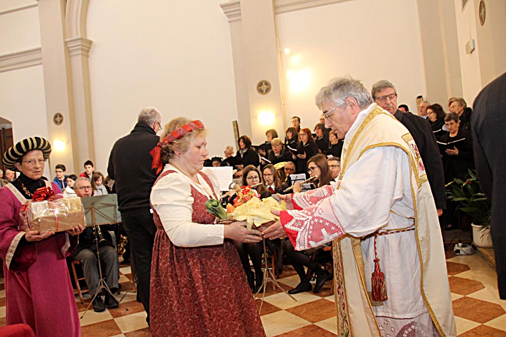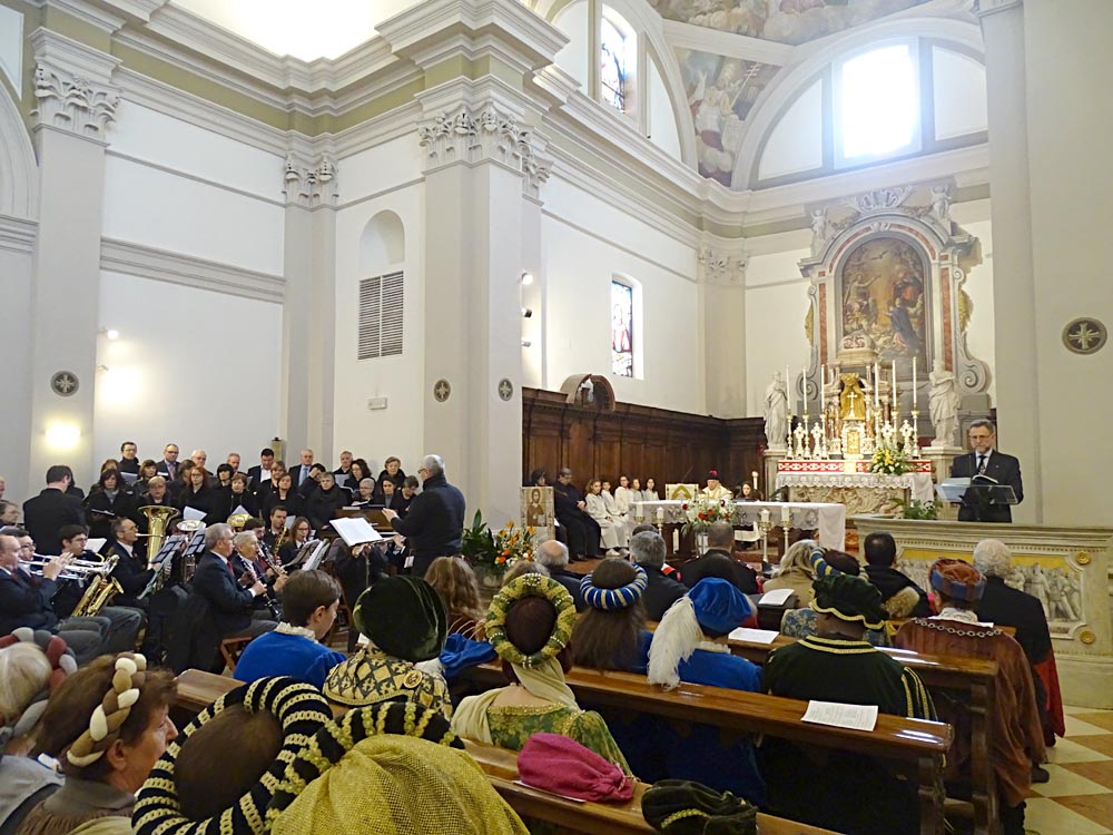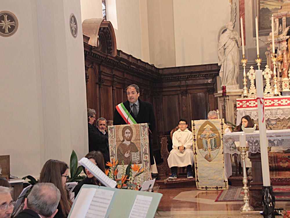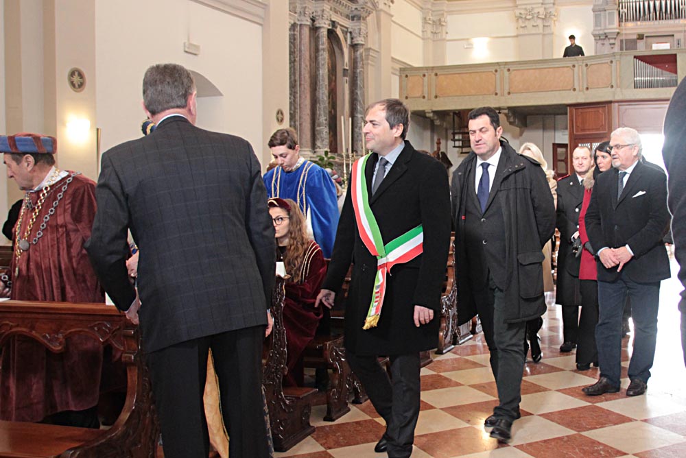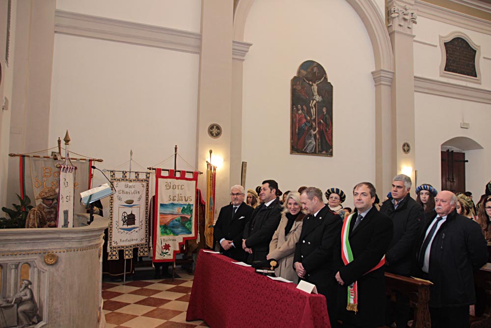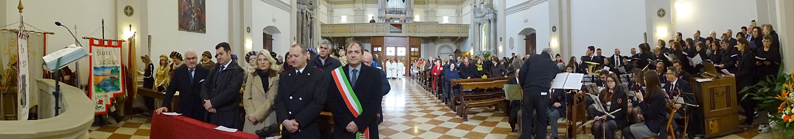 I festeggiamenti si sono svolti nella Chiesa della SS. Trinità. La Chiesa della SS. Trinità, ex parrocchiale, fu edificata dal comune in cinquant’anni a partire dal 1602, su concessione di papa Clemente VIII. Venne consacrata il 14 aprile 1652 da Marco Gradenigo, Patriarca di Aquileia. Venne ristrutturata il secolo successivo, quando fu aggiunta l’abside e vennero fatti degli interventi decorativi. Con la costruzione del Duomo andò in disuso e subì l’ingiuria del tempo e i segni della I Guerra Mondiale. Venne restaurata durante gli anni Sessanta del Novecento e riconsacrata il 30 aprile 1971. Nel 2011 sono state efficientemente restaurate le parti decorative e gli affreschi. Ha una sobria facciata sormontata da un ampio frontone triangolare con un piccolo occhio al centro. L'interno ha delle lesene lungo le pareti ornate da foglie d'acanto. All’interno, interessante è il coro delimito dai tre lati da una pregevole cantoria in noce (1710). Conserva nel soffitto affreschi di Pietro Venier (1673-1737). Nella volta del presbiterio rappresentato il Paradiso e figure di Apostoli, Evangelisti, Profeti. Sul soffitto della navata è dipinta la SS. Trinità e i Ss. Nicolò e Girolamo. Ancora: un altare barocco (1737) di Sebastiano Pischiutti; altare del Rosario con in bassorilievi raffiguranti i Quindici Misteri; pale d'altare con Incoronazione della Vergine di Giovanni Pietro Fabiaro 1643, S. Giuseppe di Pietro Bainville (1729). È presente un prezioso organo del 1780, opera del veneziano Francesco Dacci, che fu danneggiato pesantemente nella I Guerra Mondiale e fu restaurato nel 1982. |