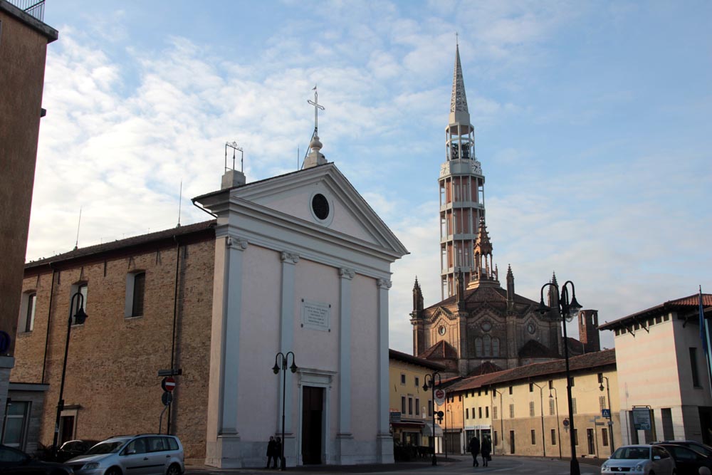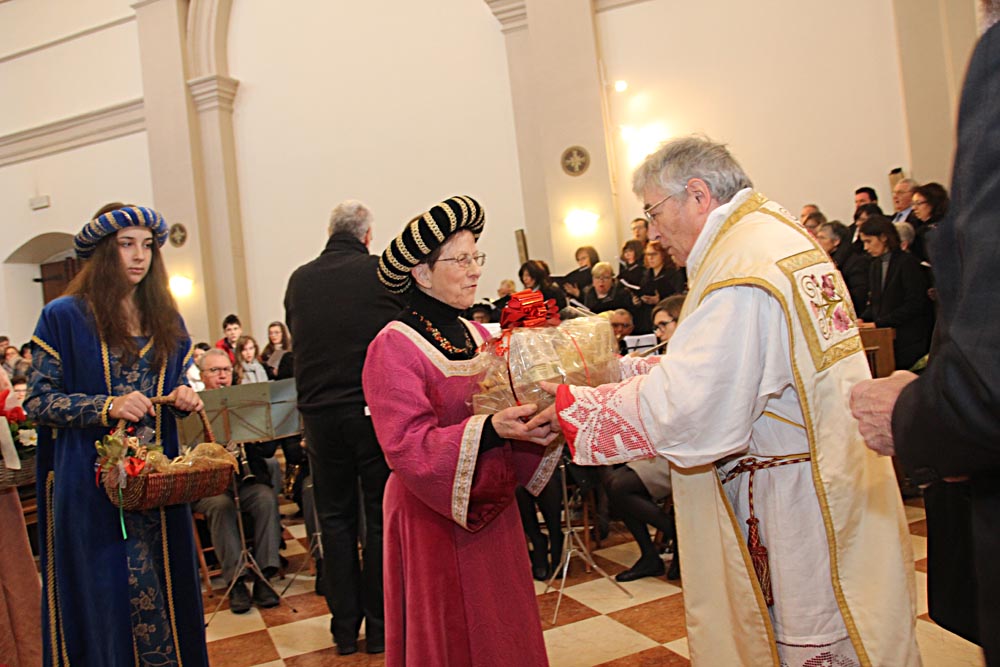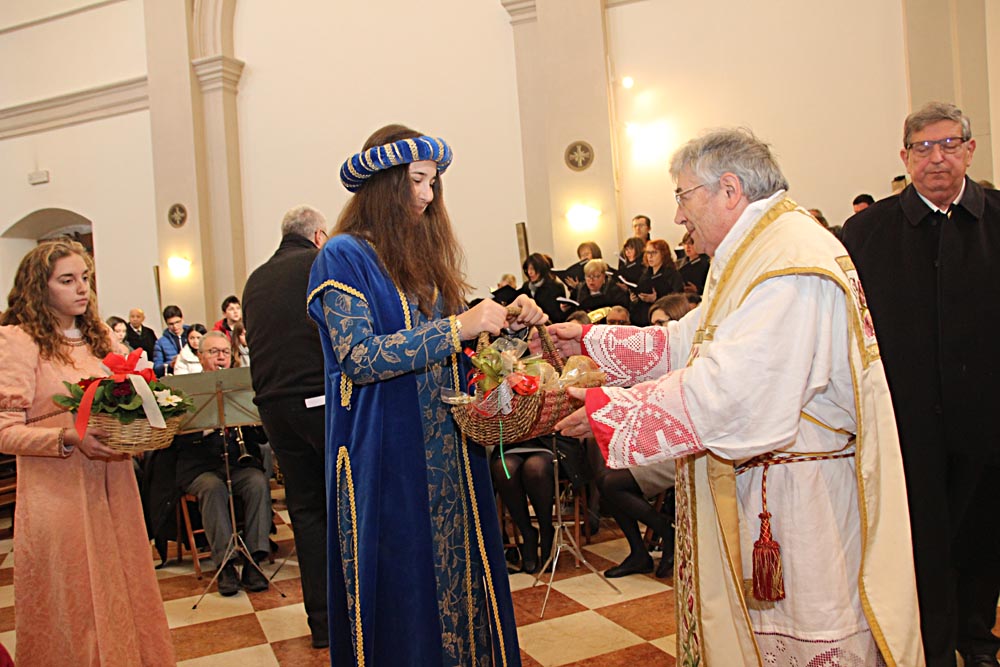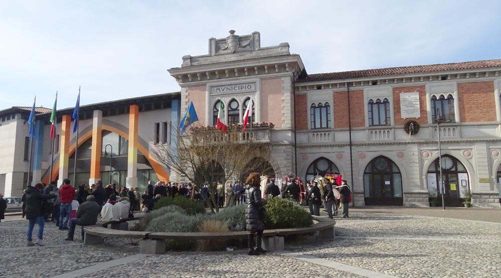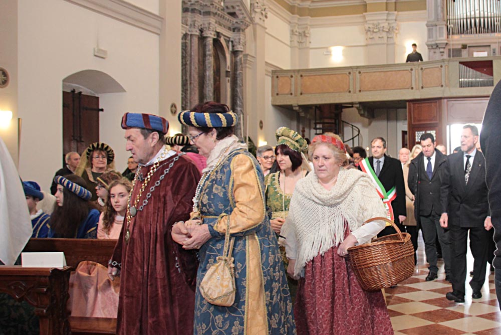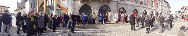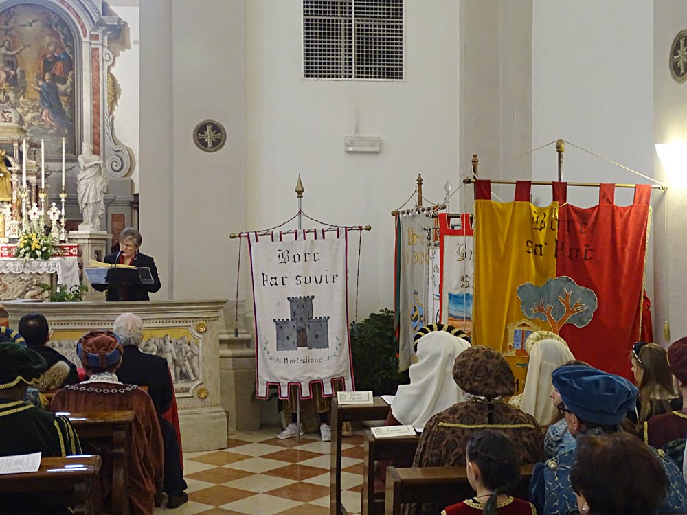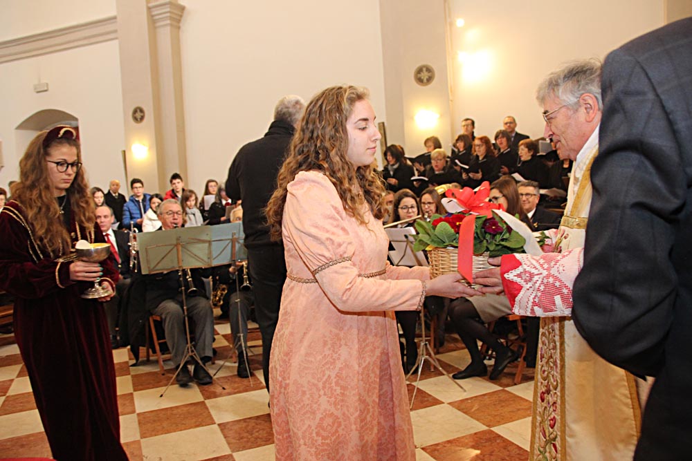 I festeggiamenti si sono svolti nella Chiesa della SS. Trinità. La Chiesa della SS. Trinità, ex parrocchiale, fu edificata dal comune in cinquant’anni a partire dal 1602, su concessione di papa Clemente VIII. Venne consacrata il 14 aprile 1652 da Marco Gradenigo, Patriarca di Aquileia. Venne ristrutturata il secolo successivo, quando fu aggiunta l’abside e vennero fatti degli interventi decorativi. Con la costruzione del Duomo andò in disuso e subì l’ingiuria del tempo e i segni della I Guerra Mondiale. Venne restaurata durante gli anni Sessanta del Novecento e riconsacrata il 30 aprile 1971. Nel 2011 sono state efficientemente restaurate le parti decorative e gli affreschi. Ha una sobria facciata sormontata da un ampio frontone triangolare con un piccolo occhio al centro. L'interno ha delle lesene lungo le pareti ornate da foglie d'acanto. All’interno, interessante è il coro delimito dai tre lati da una pregevole cantoria in noce (1710). Conserva nel soffitto affreschi di Pietro Venier (1673-1737). Nella volta del presbiterio rappresentato il Paradiso e figure di Apostoli, Evangelisti, Profeti. Sul soffitto della navata è dipinta la SS. Trinità e i Ss. Nicolò e Girolamo. Ancora: un altare barocco (1737) di Sebastiano Pischiutti; altare del Rosario con in bassorilievi raffiguranti i Quindici Misteri; pale d'altare con Incoronazione della Vergine di Giovanni Pietro Fabiaro 1643, S. Giuseppe di Pietro Bainville (1729). È presente un prezioso organo del 1780, opera del veneziano Francesco Dacci, che fu danneggiato pesantemente nella I Guerra Mondiale e fu restaurato nel 1982. |