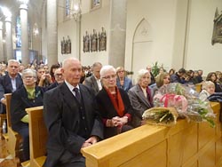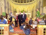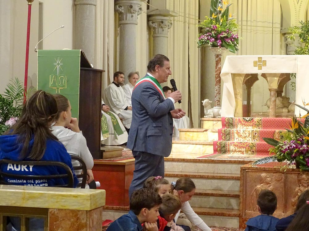 ...dopo la Comunione è seguito il saluto del Sindaco e del rappresentante delle Comunità Parrocchiali; l'offerta di un omaggio floreale ad Anna e Livio, genitori Don Nicola e la consegna di un nuovo computer portatile a Don Nicola, sicuramente molto utile nel nuovo impegno pastorale che sta per intraprendere. La serie di interventi si è concluso con il saluto augurale del Vicario Foraneo Mons. Livio Carlino, con il dono di una riproduzione longobarda della Croce di Gisulfo...