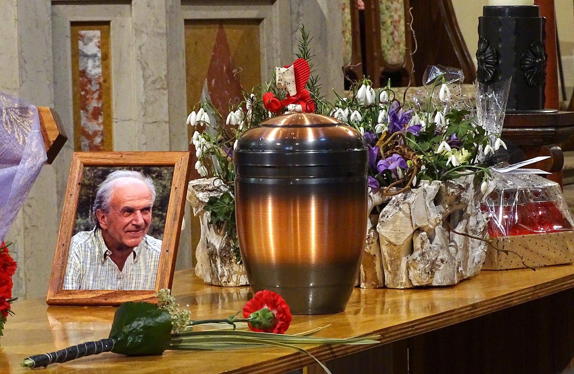 ...la foto, la urna cineraria, un garofano rosso e... tanti semplici