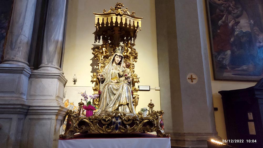 Non ho seguito l'episodio visivamente, ma alle mie spalle ho sentito il rumore dello svuotamento delle monete dal cassetto, pensando all'azione di uno degli incaricati collaboratori dell'antica parrocchia del Duomo, tanto che passandomi accanto, l'autore di questa rumorosa azione (un signore dell'apparente età di settant'anni mi ha anche gentilmente salutato. L'ho seguito visivamente mentre sostava nei pressi del Presepio e dell'entrata della Sacrestia (peraltro chiusa), poi vicino alla grande statua della Madonna... Prima di uscire dalla porta in fondo a destra, si è devotamente inginocchiato facendosi il segno della croce...!Insieme ad altri visitatori, leggendo gli avvisi più tardi abbiamo capito che nel Duomo in mattinata non era in programma nessuna celebrazione e non restava che tornare all'aperto e dirigermi verso la mia Clio parcheggiata in una Cividale irreale e completamente deserta...